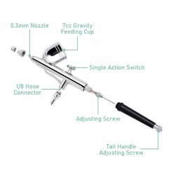 محتوای دستگاه ایربراش ناخن Airbrush Kit: یک قلم ایربراش استیل، یک کمپروسور کوچک و جمع و جور، لوله انتقال و آداپتور می باشد، که در بسته بندی خود جا داده است.